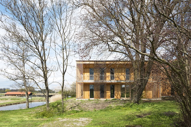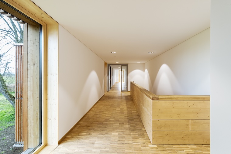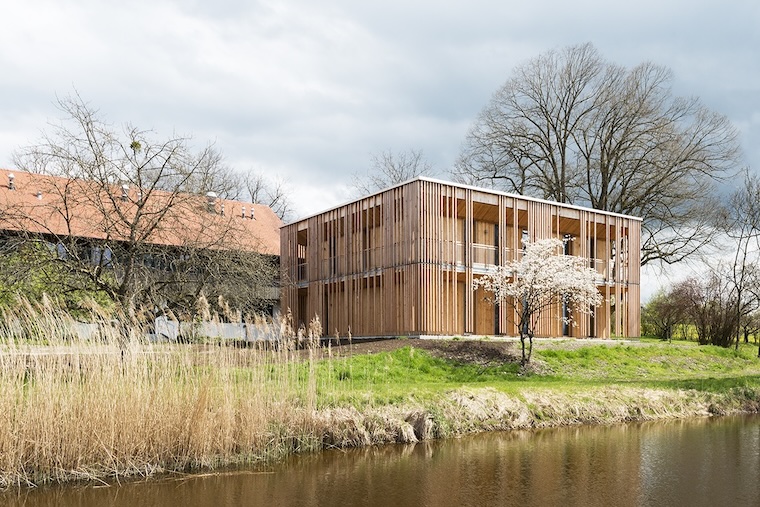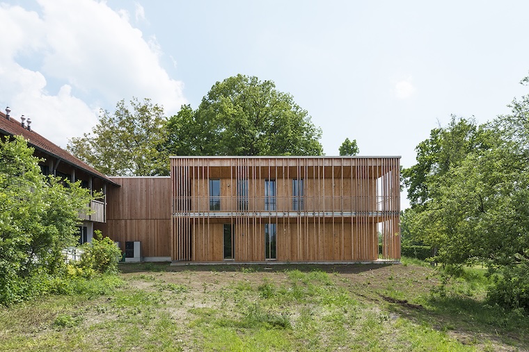 Der bestehende Laborbau aus den 1980er Jahren, als zweigeschossiges Wirtschaftsgebäude mit nord-südorientierter Firstausrichtung, ist Teil eines ländlich geprägten Ensembles. Das vollständig unterkellerte Gebäude beherbergt im UG Funktions- und Technikräume als auch Sanitärbereiche sowie Labor- und Büroräume im EG und OG. Die neue Erweiterung ergänzt den Bestand durch ein solitäres Gebäude mit einer Grundfläche von 12,5 x 12,5 m und einem Verbindungsbau. Beide Teile sind nicht unterkellert und in Holzbauweise ausgeführt. Die gewinkelte Anordnung der Erweiterung in Bezug auf das Bestandsgebäude reagiert zum einen auf raumbildende Aspekte des Grundstücks und der vorhandenen Vegetation und zum anderen auf einen geforderten Mindestabstand zur benachbarten Wetterstation im Süden.