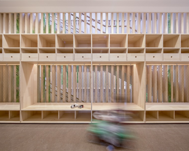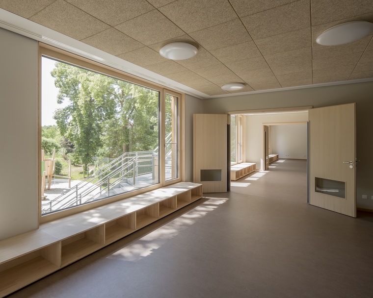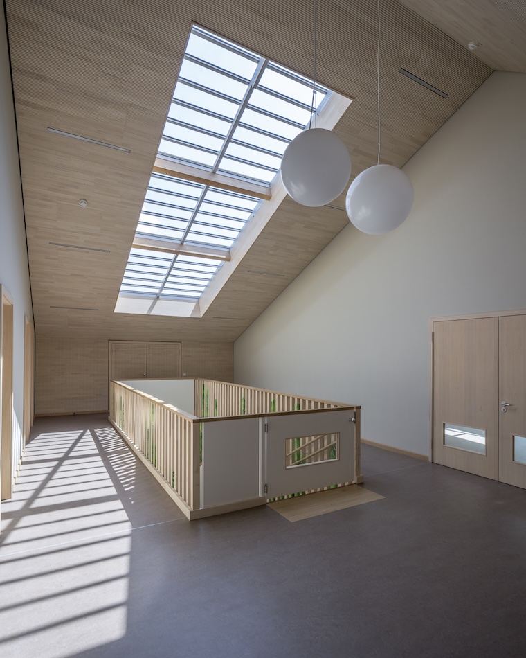 Dies erzeugt ein Bild, das die harte schützende Hülle des Gebäudes beschreibt, das die weichen, in Holz verschalten Giebelseiten birgt. Die archaische Form des Gebäudes interpretiert die kindliche Darstellung eines Hauses und führt zu einem hohen Identifikationsgrad.