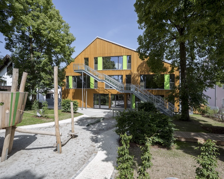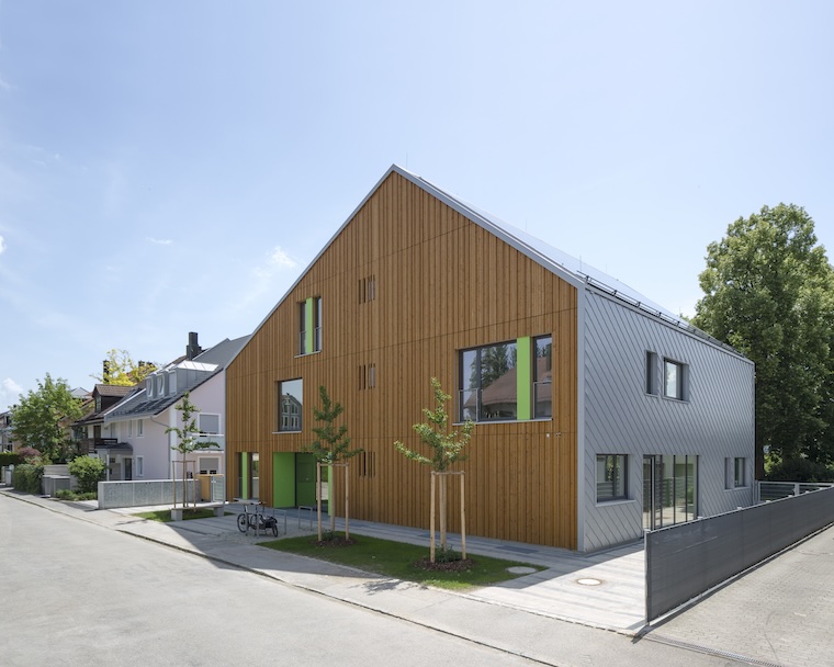 Die Bauweise ist eine Mischform (Hybrid) aus Massivbau und Holzbau. Das gesamte Untergeschoss sowie die Decken und tragenden Wände im EG und OG wurden in Stahlbeton ausgeführt. Die gesamte Gebäudehülle, also Außenwände und Dach, wurden in vorgefertigter Holzrahmenbauweise errichtet. Die konstruktive Unterscheidung ist am und im Gebäude durch differenzierte Materialsprache und Oberflächen ablesbar und begreifbar. Die äußere und innere Erscheinung des Gebäudes ist geprägt von der Materialität des Holzes. Die Fassade besteht aus einer offenen profilierten, naturlasierten Fichtenholzschalung.