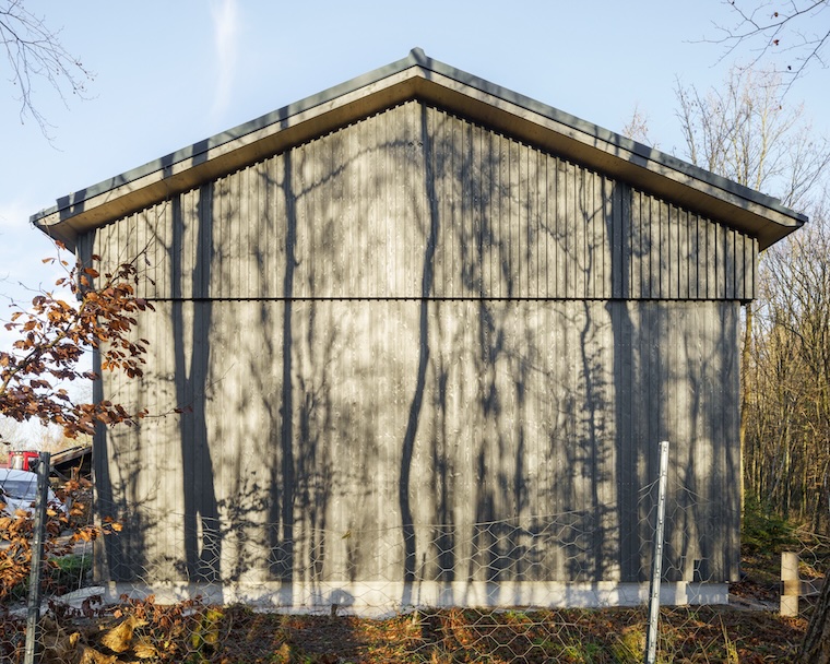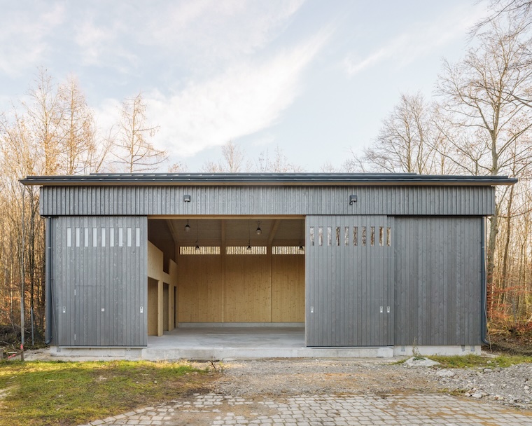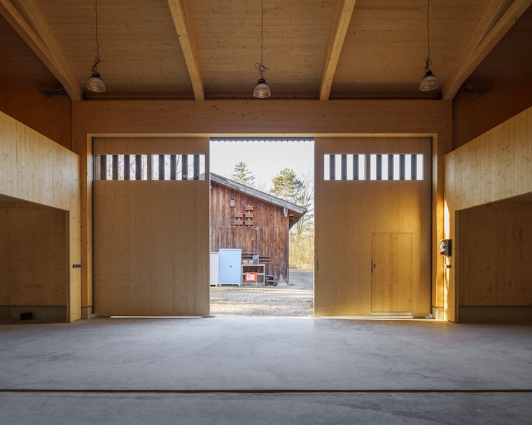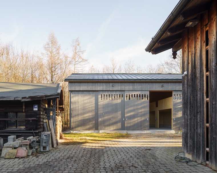Das Gebäude selbst mit seinen äußeren Abmessungen von ca. 10 m Breite, 15 m Länge und 8 m Höhe ist in seiner Struktur und Ausführung mit einem stützenfreien Innenraum und breitem Schiebetor durch seine Nutzung definiert. Die Materialität aus Holz orientiert sich an dem am Ort Vorhandenen. Die bestehenden Wirtschaftsgebäude sind charakterisiert durch die mittlerweile vergraute Schalung aus Fichtenholz. Der neue Bau nimmt die Ästhetik des Bestands in weiterentwickelten Details auf und fügt sich durch eine vorvergraute Fassade harmonisch ein.