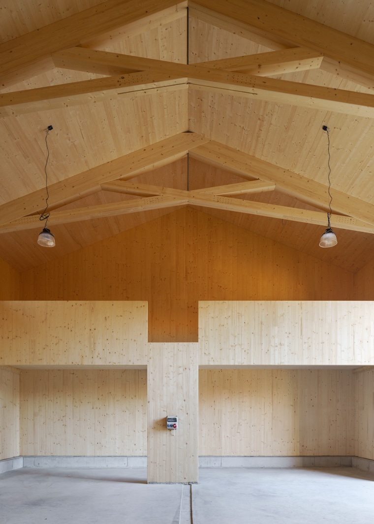 Der helle Innenraum wirkt kontrastierend zur äußeren dunklen Hülle und ist von den naturbelassenem Brettsperrholzwänden und dem feinen Tragwerk der Fachwerkbinder geprägt. Ein Hauptmerkmal des Tragwerks ist der Scheren-Fachwerkbinder des Satteldaches, der auf Stützen und tragenden Brettsperrholzwänden aufliegt. Die gesamte Konstruktion ist sichtbar belassen. Die Verbindungsmittel werden ebenfalls bewusst gezeigt um zum einen den Charakter einer Maschinenhalle zu thematisieren und zum anderen die Rückbaubarkeit und Wiederverwendung der Bauteile an anderer Stelle zu ermöglichen.